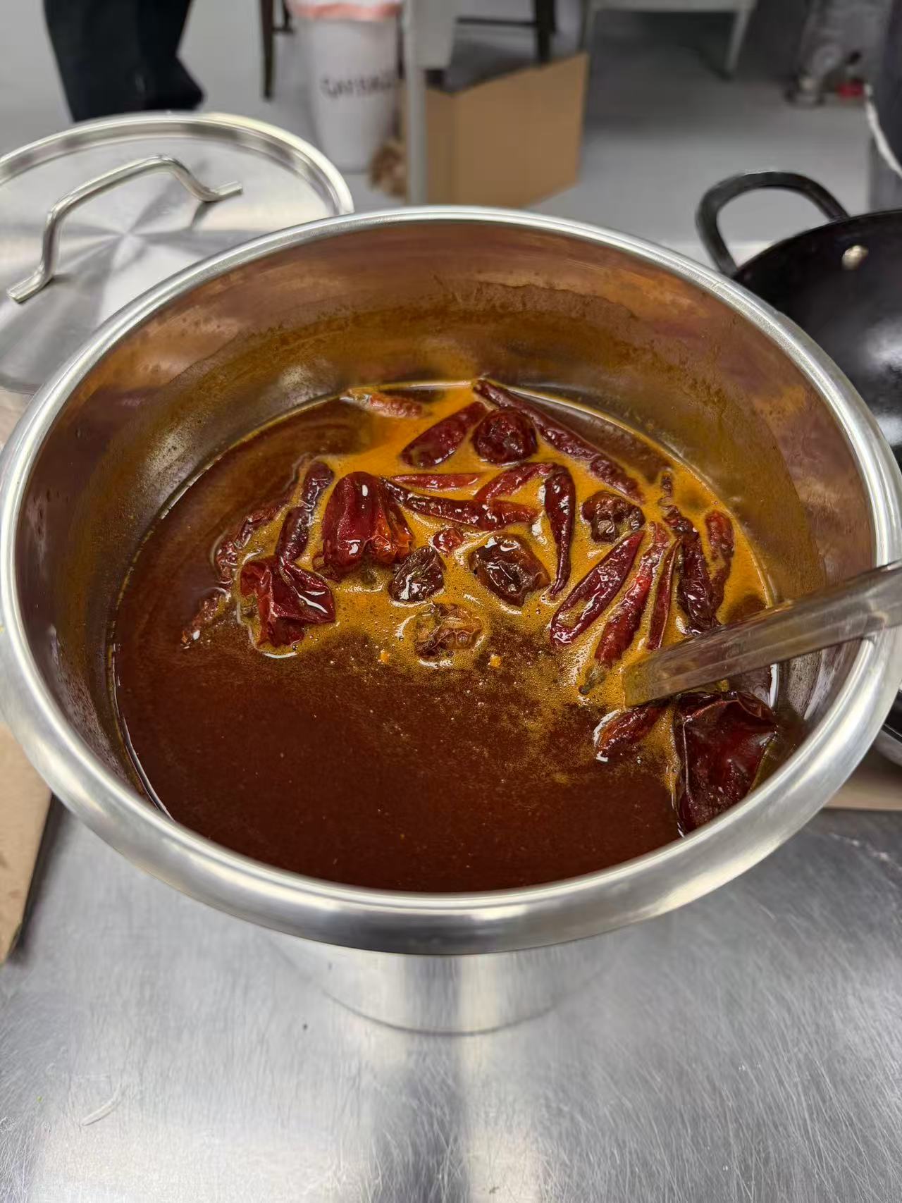 不含工业辣椒精的纯手工红油。来自柳州当地供应商的三种不同干辣椒品类,自己用机器研磨成粉。所以是不含任何杂质的100%纯辣椒面。再通过慢火熬制葱姜料油来激发出辣椒面不同层次的椒香气。搭配在螺蛳粉的汤底里,不仅仅是增添了辣味,更多的是让汤底的鲜香更具回味。真的很绝~
